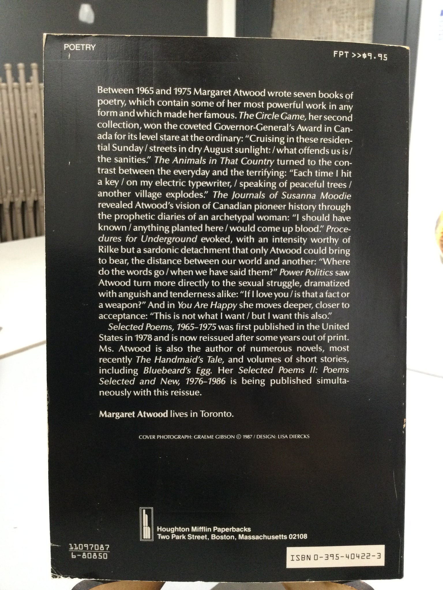 Selected Poems 1965-1975, by Margaret Atwood (used paperback, ISBN 0395404223, Houghton Mifflin, 1976)