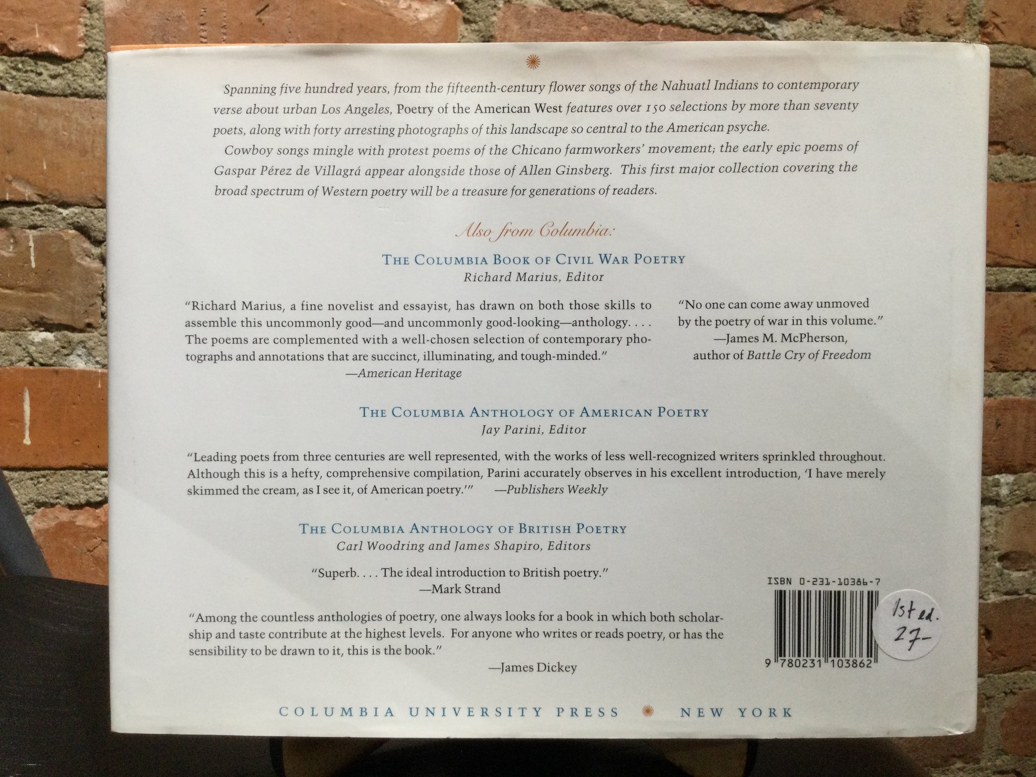 Poetry of the American West: A Columbia Anthology, edited by Alison Hawthorne Deming (used hardcover, ISBN 0231103867, Columbia University Press, 1996)