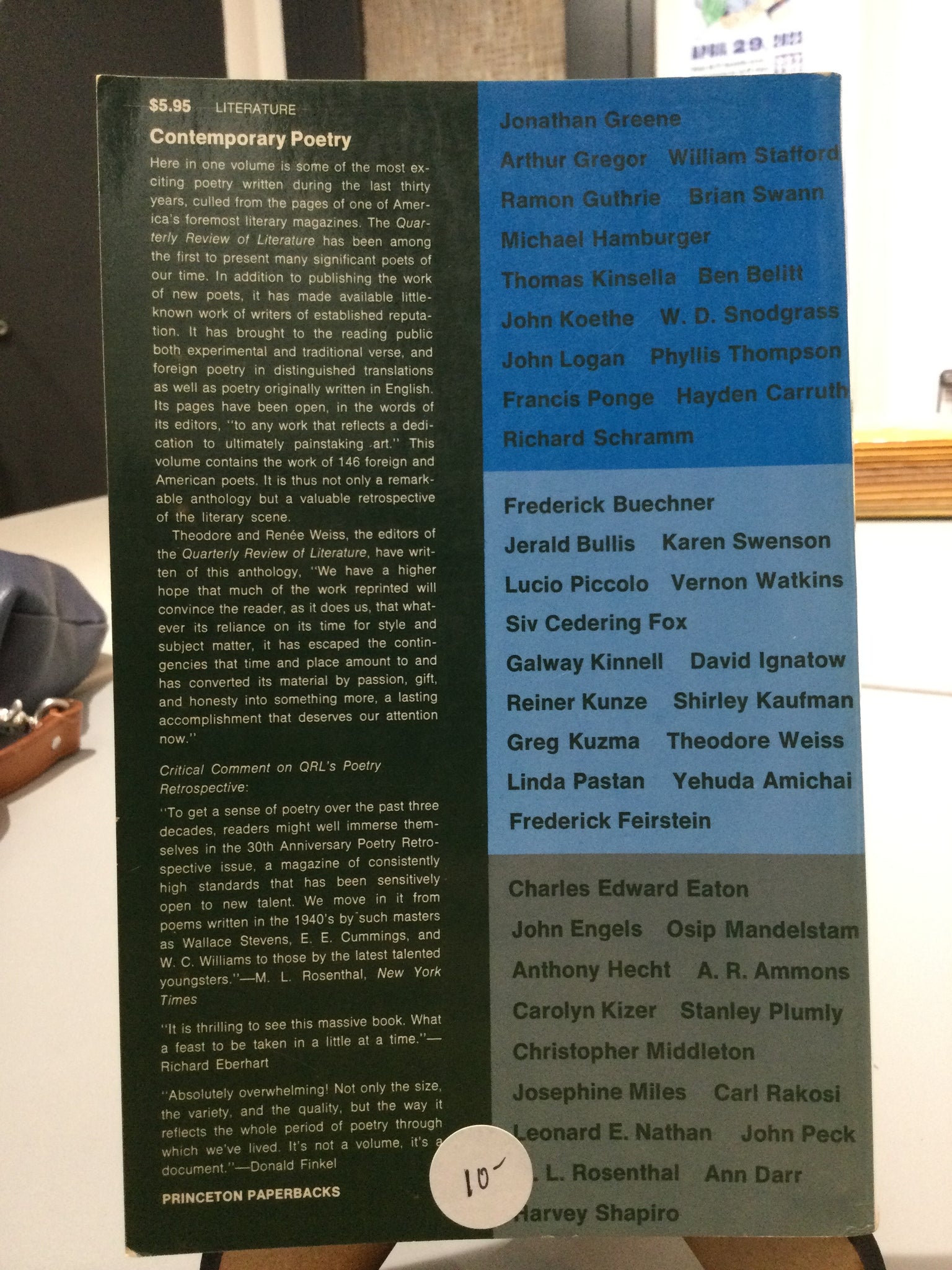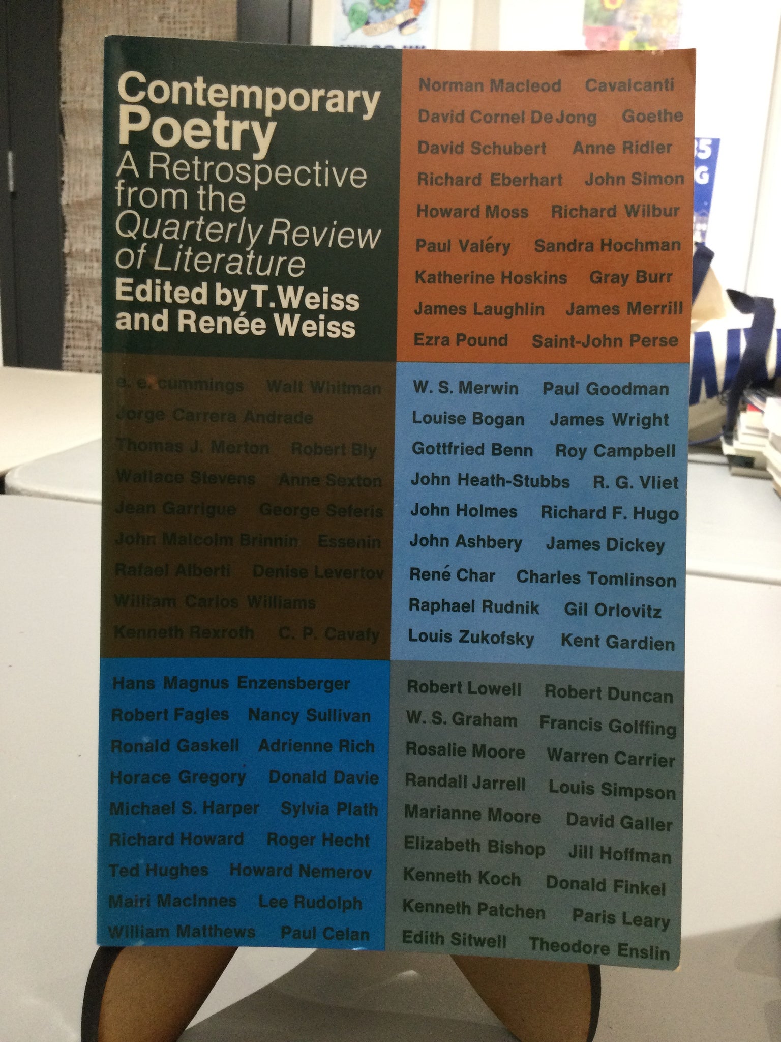Contemporary Poetry: A Restrospective from the Quarterly Review of Literature, edited by T. Weiss and Renée Weiss (used paperback, ISBN 0691013241, Princeton University Press, 1975)