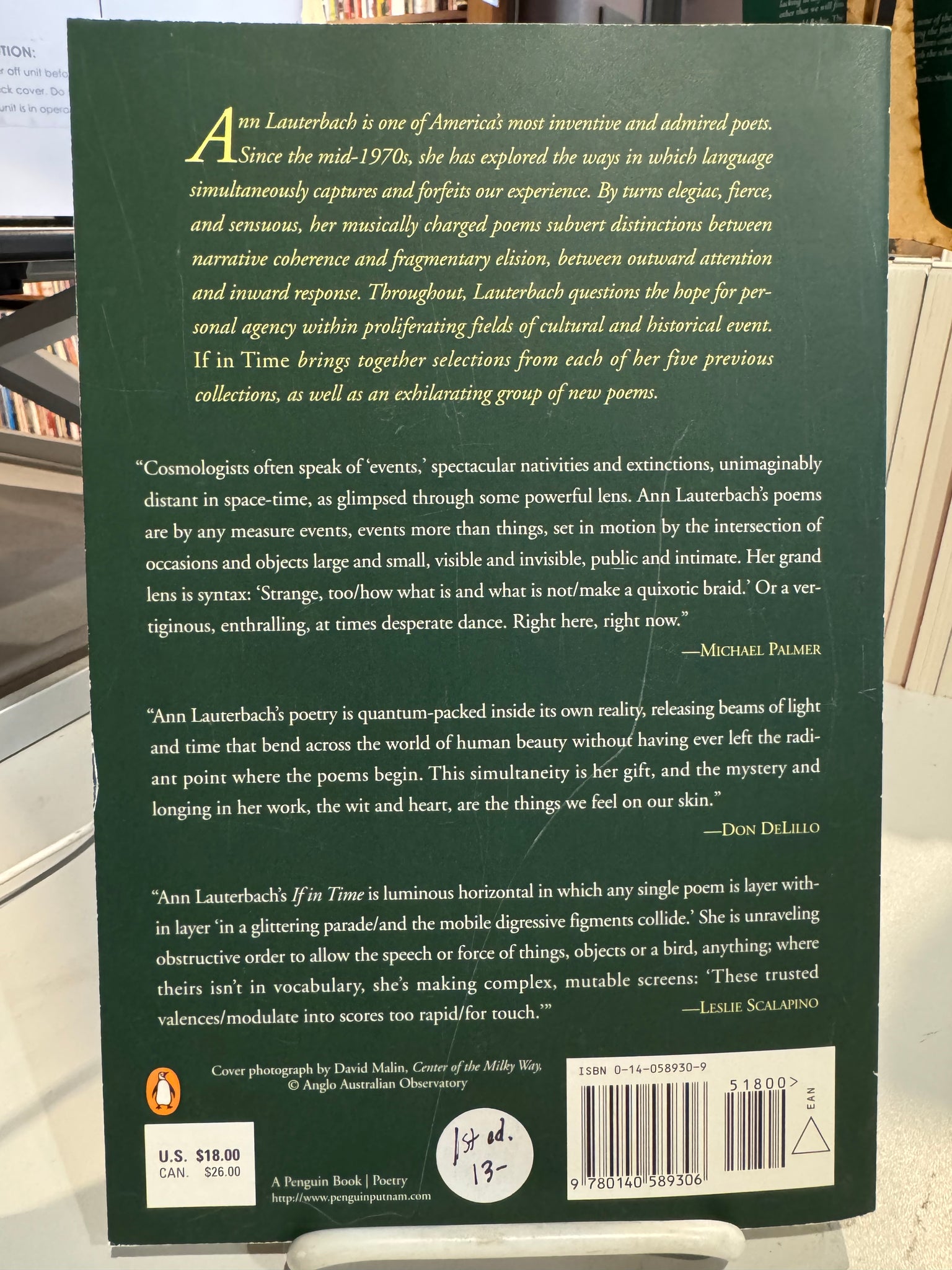 If in Time: Selected Poems 1975-2000 by Ann Lauterbach (used paperback, ISBN 0140589309, Penguin, 2001)