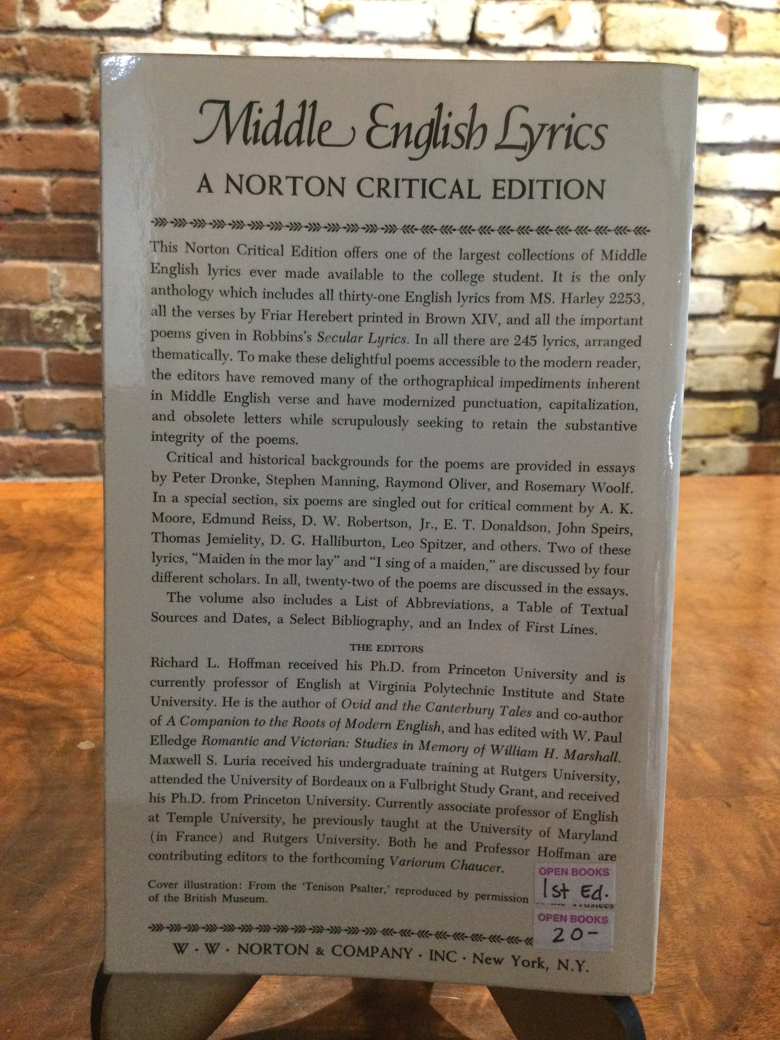 Middle English Lyrics, selected and edited by Maxwell S. Luria and Richard L. Hoffman (used paperback, ISBN 0393093387, Norton Critical Editions, 1974)