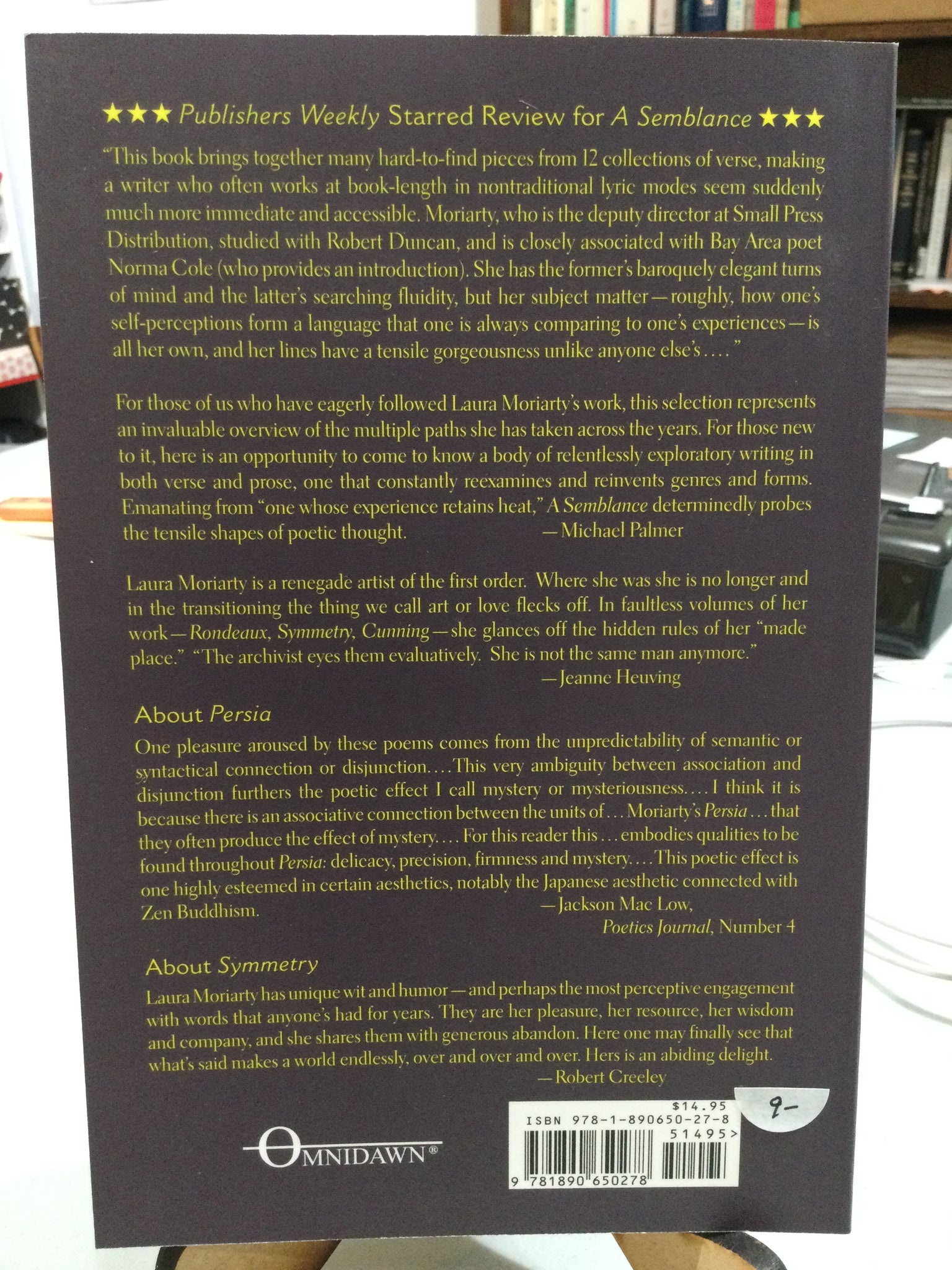 A Semblance: Selected and New Poems 1975-2007, by Laura Moriarty (used paperback, ISBN 9781890650278, Omnidawn, 2007)