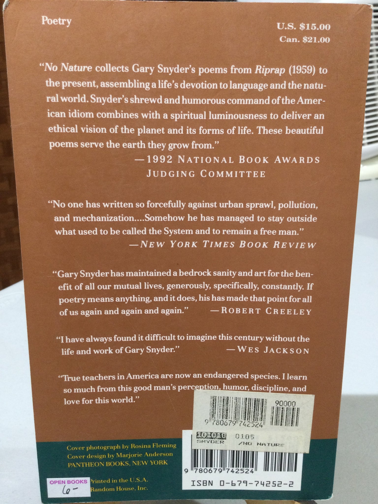 No Nature: New and Selected Poems, by Gary Snyder [used paperback, ISBN 0679742522, Random House, 1992)