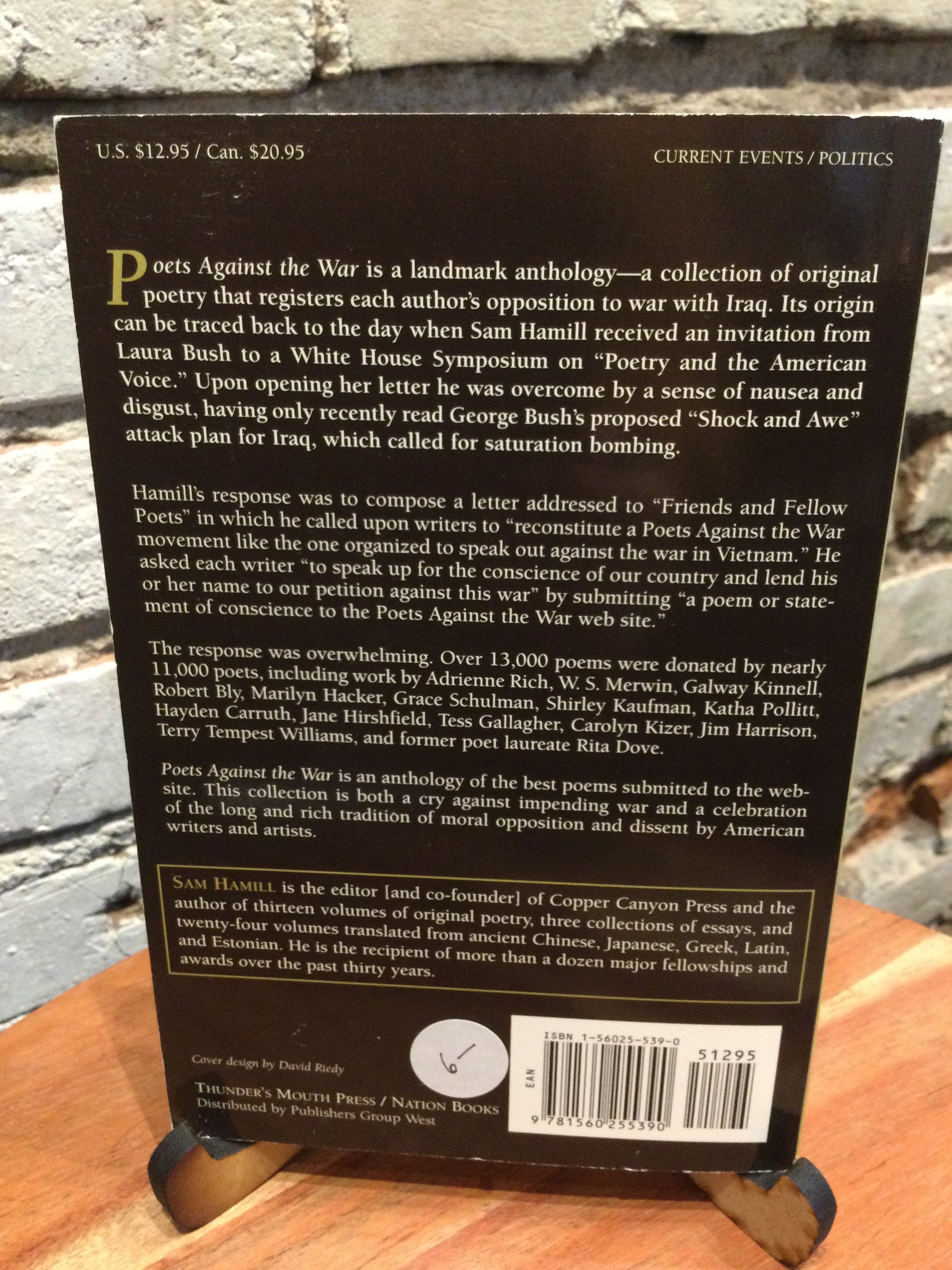 Poets Against the War, Ed. Sam Hamill (used paperback, ISBN 1560255390, Nation Books, 2003)