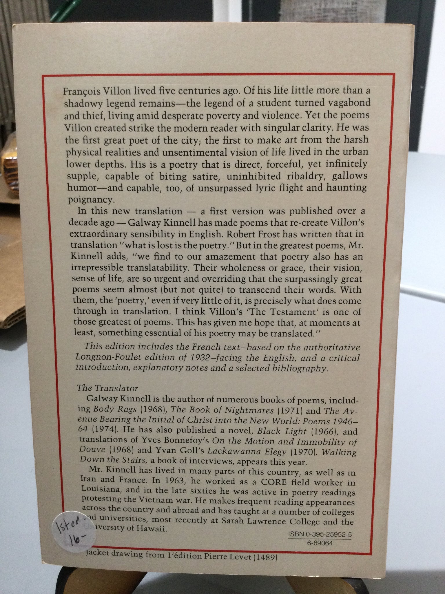 The Poems of François Villon, translated by Galway Kinnell (used paperback, ISBN 0395259525, Houghton Mifflin Company, 1977)