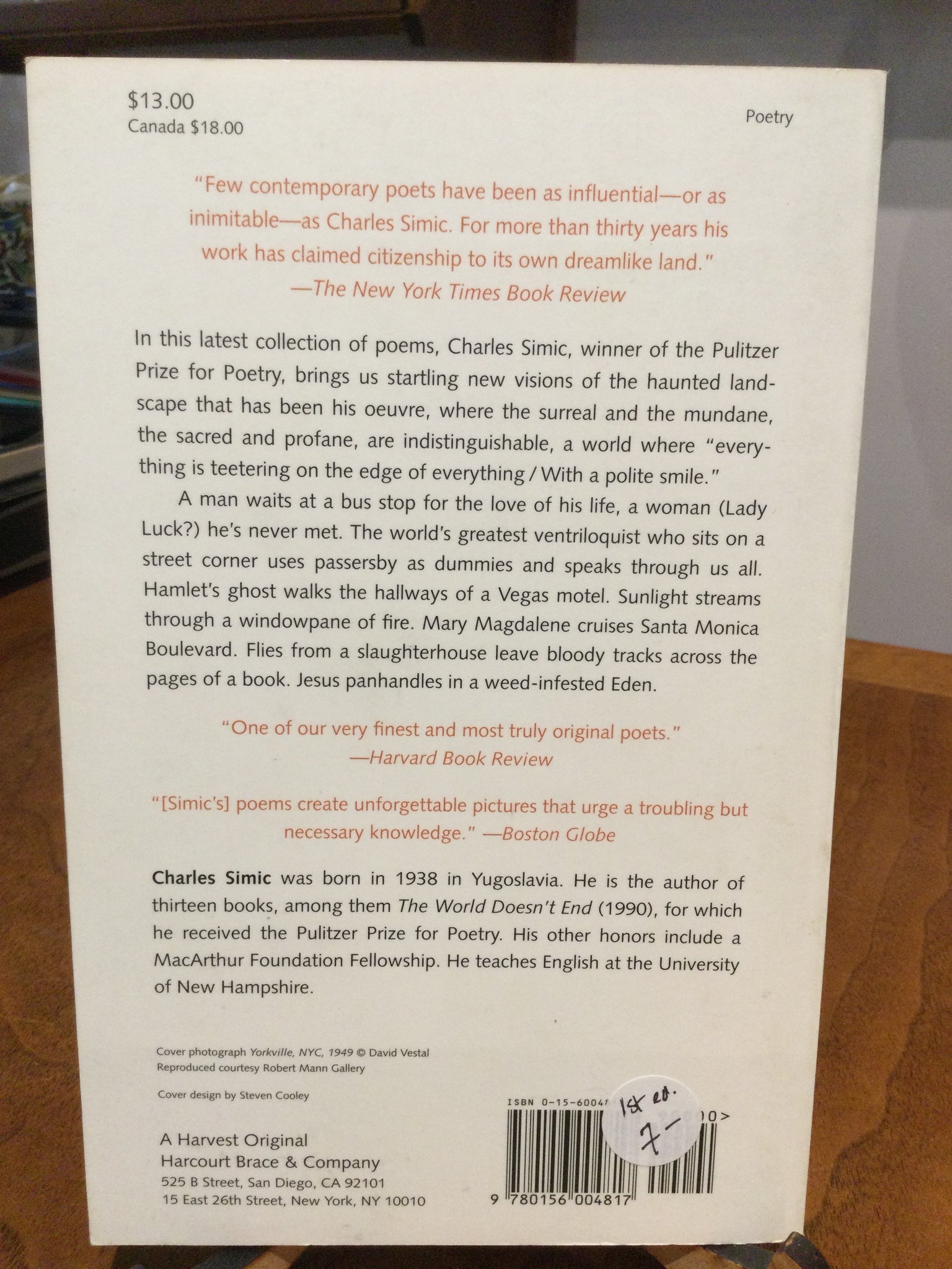 Walking the Black Cat, by Charles Simic (used paperback, ISBN 015600481x, Harcourt Brace, 1996)