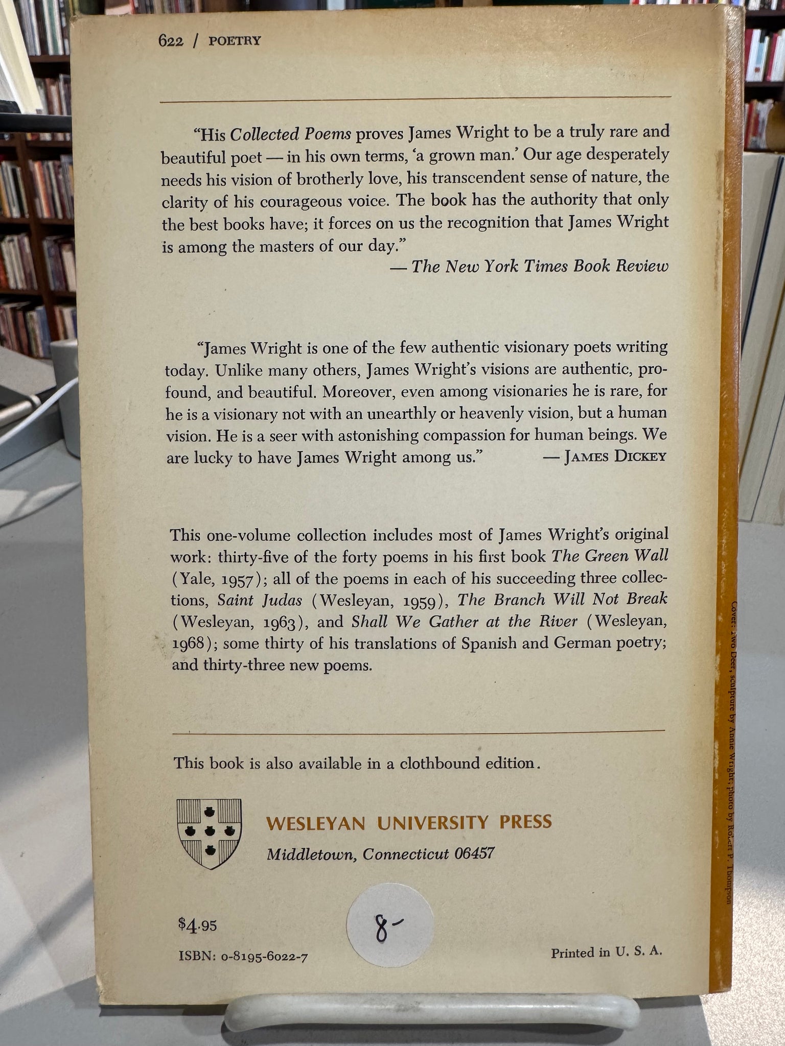 Collected Poems by James Wright (used paperback, ISBN 0819560227, Wesleyan University Press, 1974)