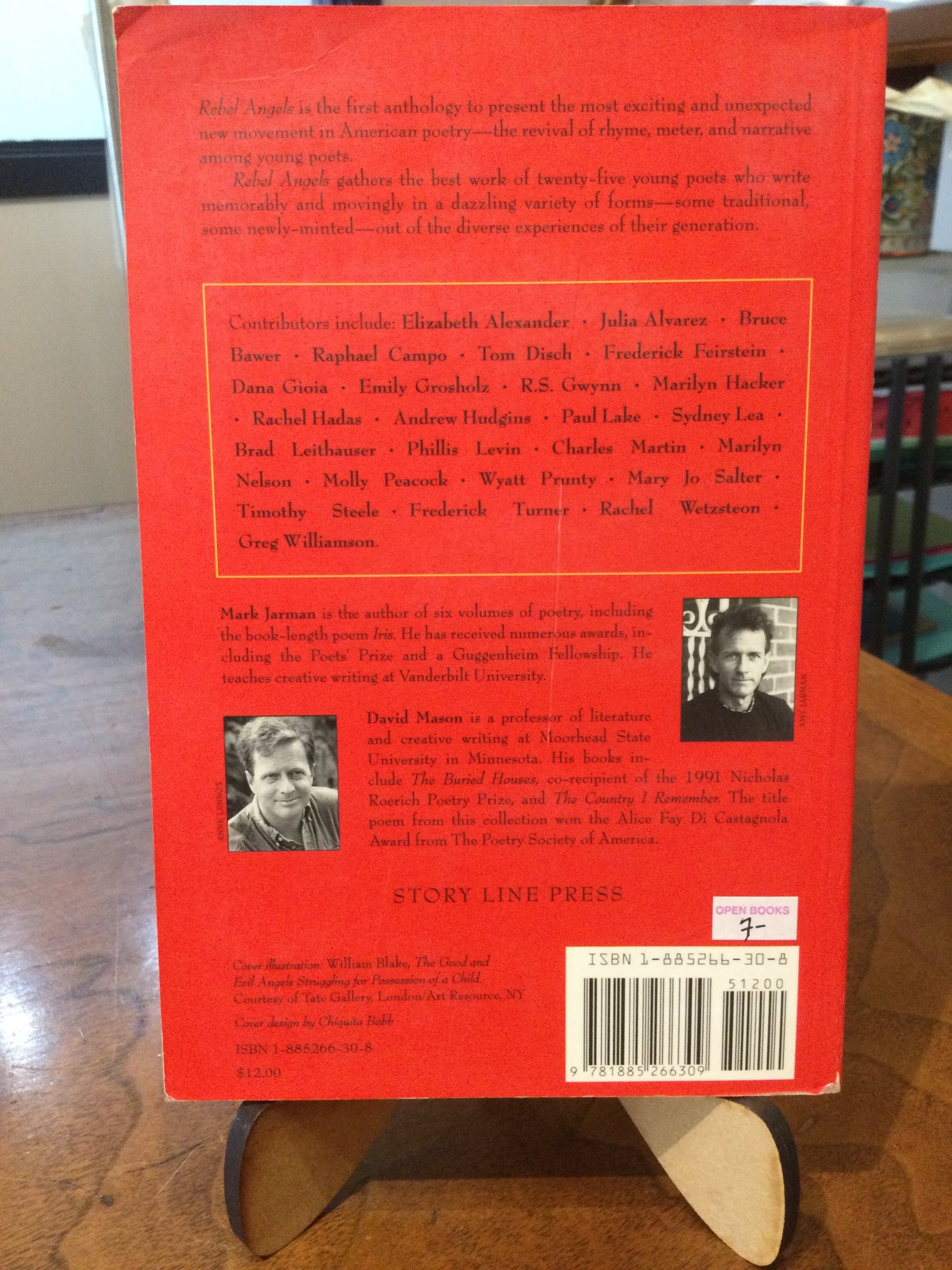 Rebel Angels: 25 Poets of the New Formalism, ed. Mark Jarman and David Mason (used paperback, ISBN 1885266308, Story Line Press, 1996)